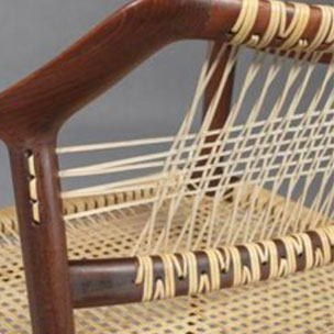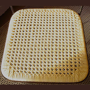 Bilder oben: Die Restaurierung eines Geflechtes an einem Design-Klassikers 'Mies v.d. Rohé. Freischwinger Sessel