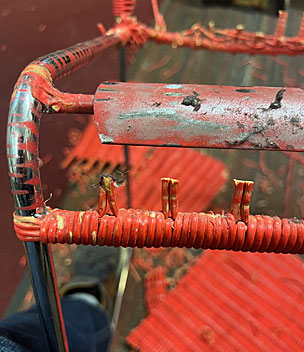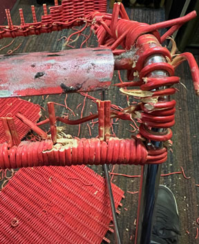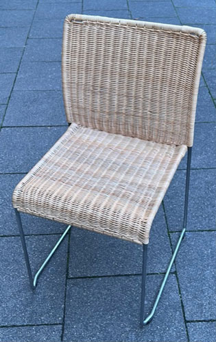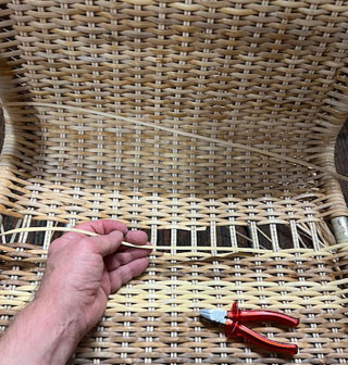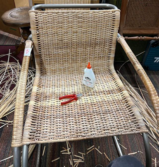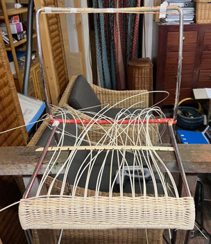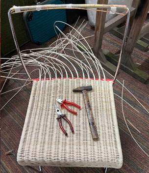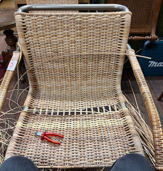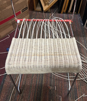 Bilder oben: Die Restaurierung eines Geflechtes an einem italienischen Design-Klassikers. Peddigrohr-Stahl-Stuhl