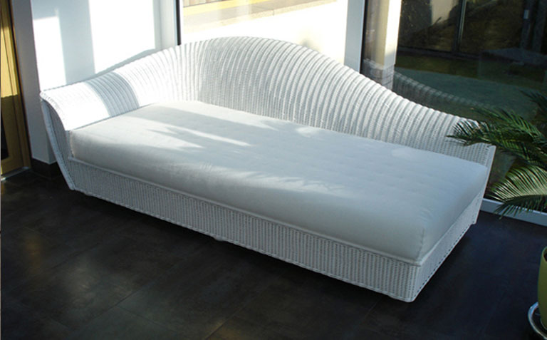 KS/12 Korb-Recamiére Sonderanfertigung in weiß basiert auf dem Modell KS/6 217 x 112 x 85 cm. Kissenauflage aus hochwertigem, festem Schaumstoff, dazu 3 Kissen Stoffbezug weiß, mit Reißverschluß abziehbar. |